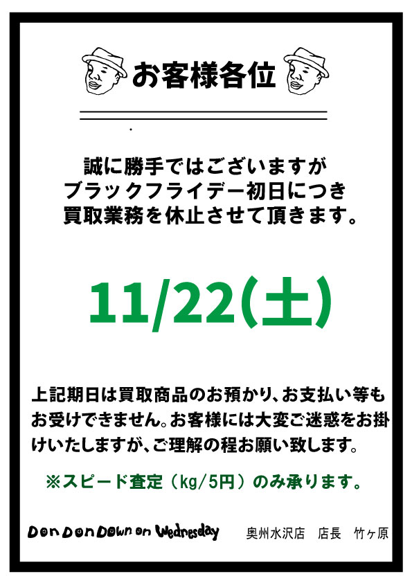 また、11/22(土)は買取をお休みさせていただきます。予めご了承ください。