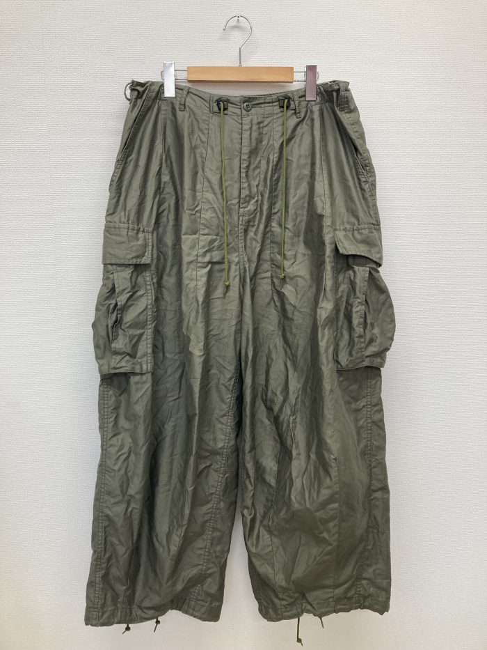 一見すると普通のカーゴパンツですが、履いてみるとNeedlesらしい高級感のある素材で一般的なカーゴパンツにはないドレープ感があります。ウエストのドローコードはピッタリ絞ると足の真ん中あたりに来る位置に設けられており、絞ることによって生地が吊り上がりヒザデルらしいシルエットになります。