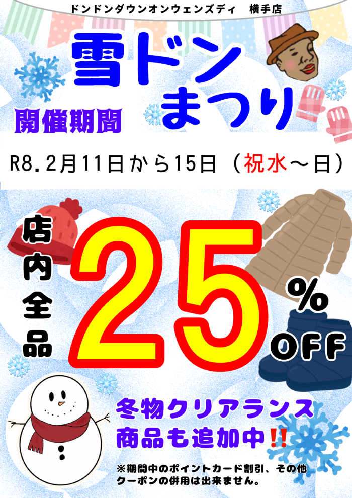 2月9日(月) 11日~雪ドン祭り開催!! ドンドンダウン横手店です。 11日∼雪ドン祭り開催いたします! 対象外商品一切ございません♪ 店内全品ニコニコ25%OFF! 2月11日∼15日 5日間限定開催!! 11日雪ドン祭りを開催いたしております。ぜひこの機会に、皆様お誘い合わせの上ご来店くださいませ。 2026年2月9日 Info